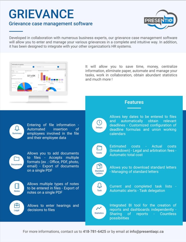Developed in collaboration with numerous business experts, our grievance case management software will allow you to enter and manage your various grievances in a complete and intuitive way. In addition, it has been designed to integrate with your other organization’s HR systems.